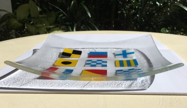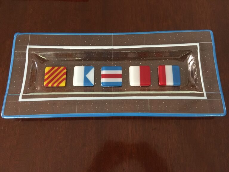 Additional glass pieces are cut and fitted in two layers around the selected flags to create the platter or glass art object.